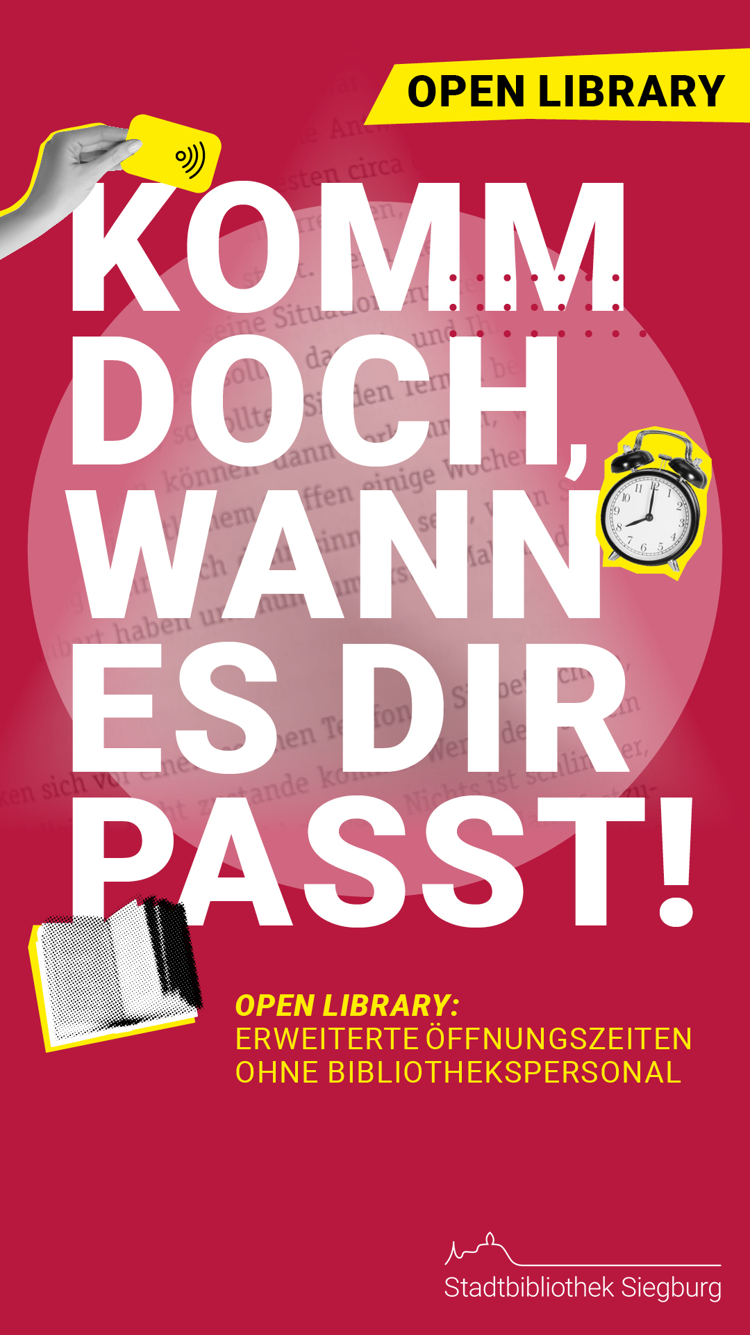 Open Library: 08:00 - 10:00 Uhr und 17:00 - 20:00 Uhr Beachten Sie auch unsere Schließzeiten!