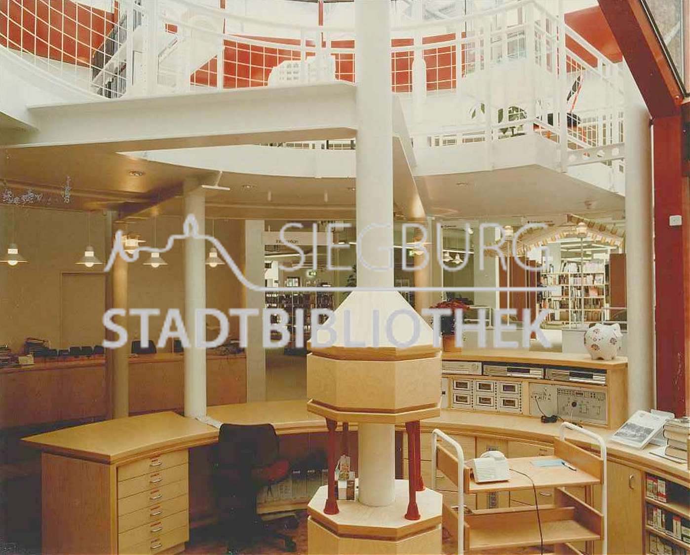 Mitten im Krieg, am 18. Oktober 1942, eröffnet Siegburg seine erste Stadtbücherei in einem angemieteten Ladenlokal Ecke Ringstraße/Bahnhofstraße. Die Kunden werden an einer Theke bedient, selbst aussuchen und anschauen kann man sich die Bücher nicht.