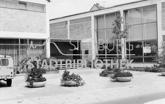 1962 bekommt die Stadtbücherei ein neues, sehr modernes langfristiges Zuhause in der Grimmelsgasse – mitsamt Lesegarten im Außenbereich mit Teich und Sitzmöglichkeiten. Der Neubau wird von dem Unternehmerpaar Alfred und Eleonore Keller gestiftet. Auf den Tag genau zwanzig Jahre nach der ersten Eröffnung findet die feierliche Einweihung statt. Ebenfalls neu: Erstmals dürfen die Bibliothekskunden an frei zugänglichen Regalen in den Büchern stöbern und sich die Literatur alleine heraussuchen.